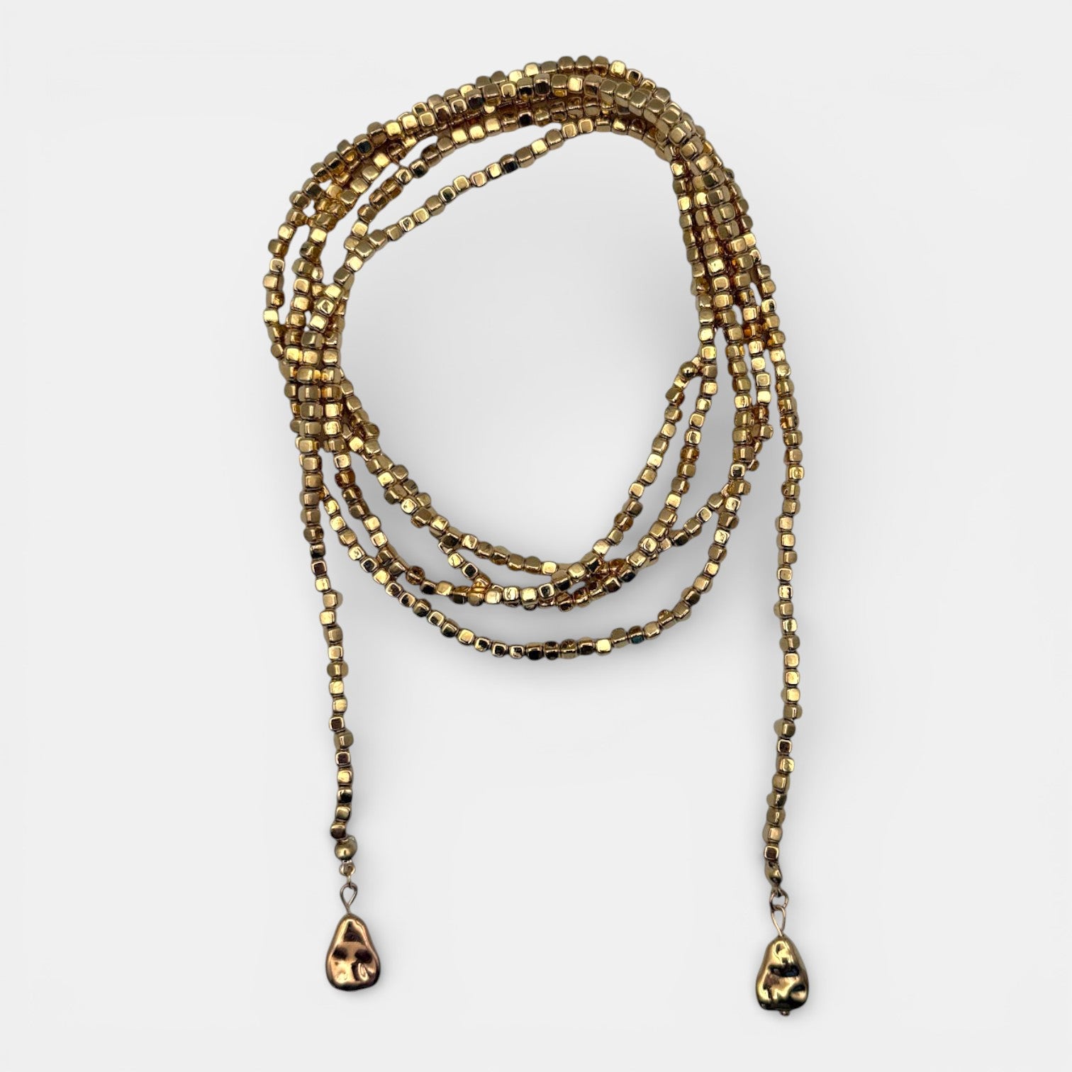 Die 'ik ben de baas'-vibe? ✨ Die krijg je instant met de Layered Square Tailleketting. Deze opvallende goudkleurige ketting, verrijkt met meerdere lagen lichtgewicht beads, is jouw finishing touch voor die gedurfde look. Stylingtip: Draag 'm over je oversized blazer of favoriete jurk voor instant main character energy.